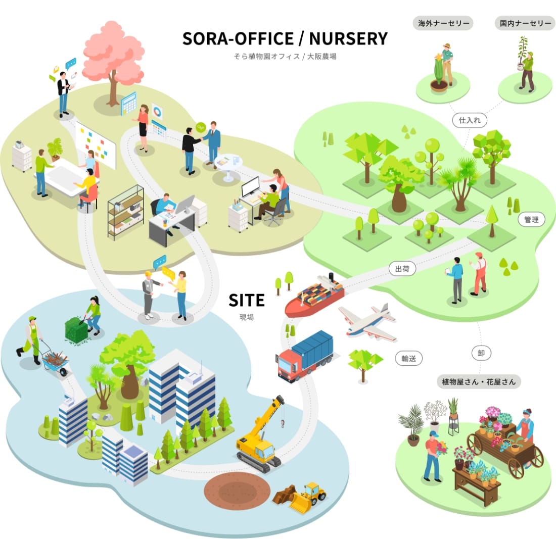 そら植物園では、植物の卸販売から、造園の設計・施工、造園工事、空間演出、イベント装飾、レンタルグリーン、植栽管理、植物引き取りまで、国内外の行政機関や企業、教育機関、地方自治体などさまざまな方から寄せられる「植物に関わるあらゆるご依頼・ご相談」にお応えし事業を行っています。